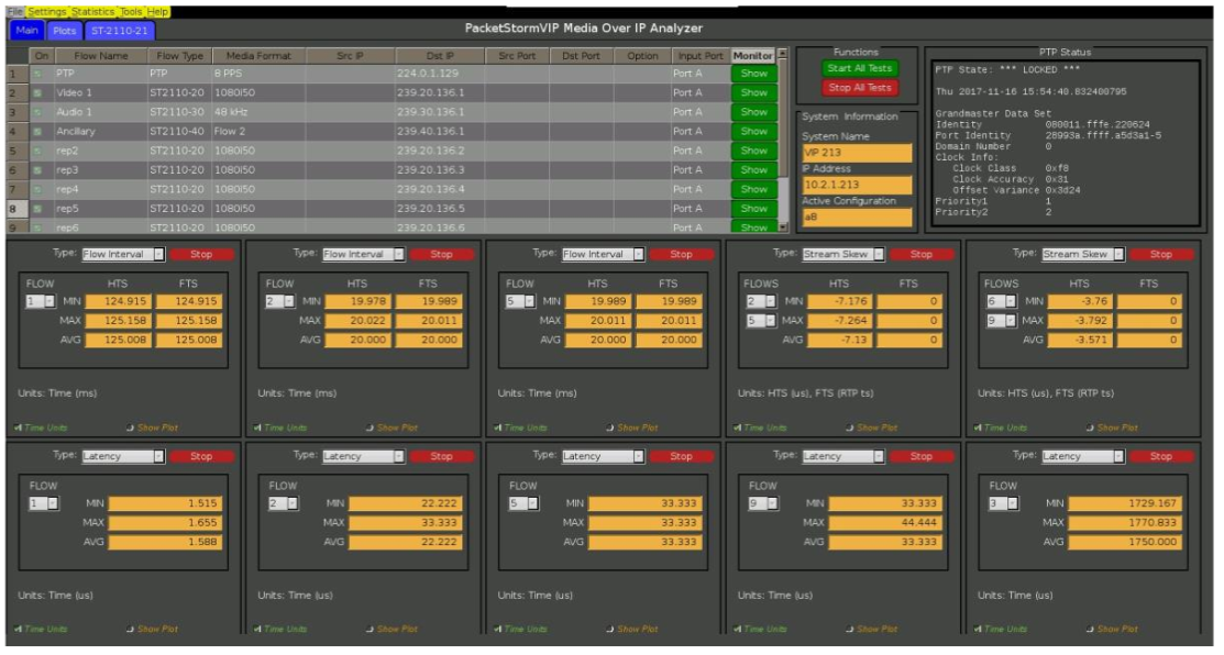 - ST2110-10,20,30,40 The fluctuation of each RTP content packet can be measured in real time by using the hardware time stamp and RTP time stamp. Also, up to 10 items can be arbitrarily selected and monitored simultaneously.